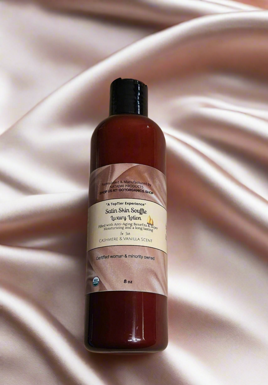 Our newest "Top Tier" Luxury lotion Satin Skin Souffle in "Cashmere & Vanilla" is rich in vitamins and high end organic ingredients that support collagen production and all day hydration and leaves skin supple and irresistible to touch.