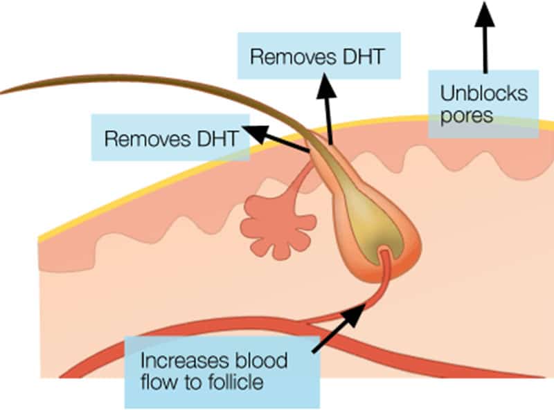 SAW PALMETTO is believed to work by inhibiting the activity of 5-alpha-reductase, an enzyme involved in the conversion of the hormone testosterone to dihydrotestosterone (DHT). DHT is considered a key contributing factor to the onset and progression of androgenic alopecia. Saw palmetto also is believed to increase the activity of an enzyme responsible for the metabolism of DHT into androstanediol (a weaker androgen hormone).