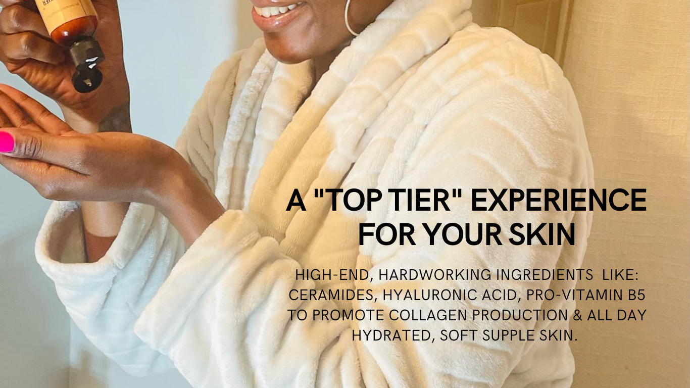 This lotion is a "Top Tier" experience! Our lotion boasts high end and hardworking ingredients like Organic Ceramides, Fatty Acids, Pro-Vitamins and more!